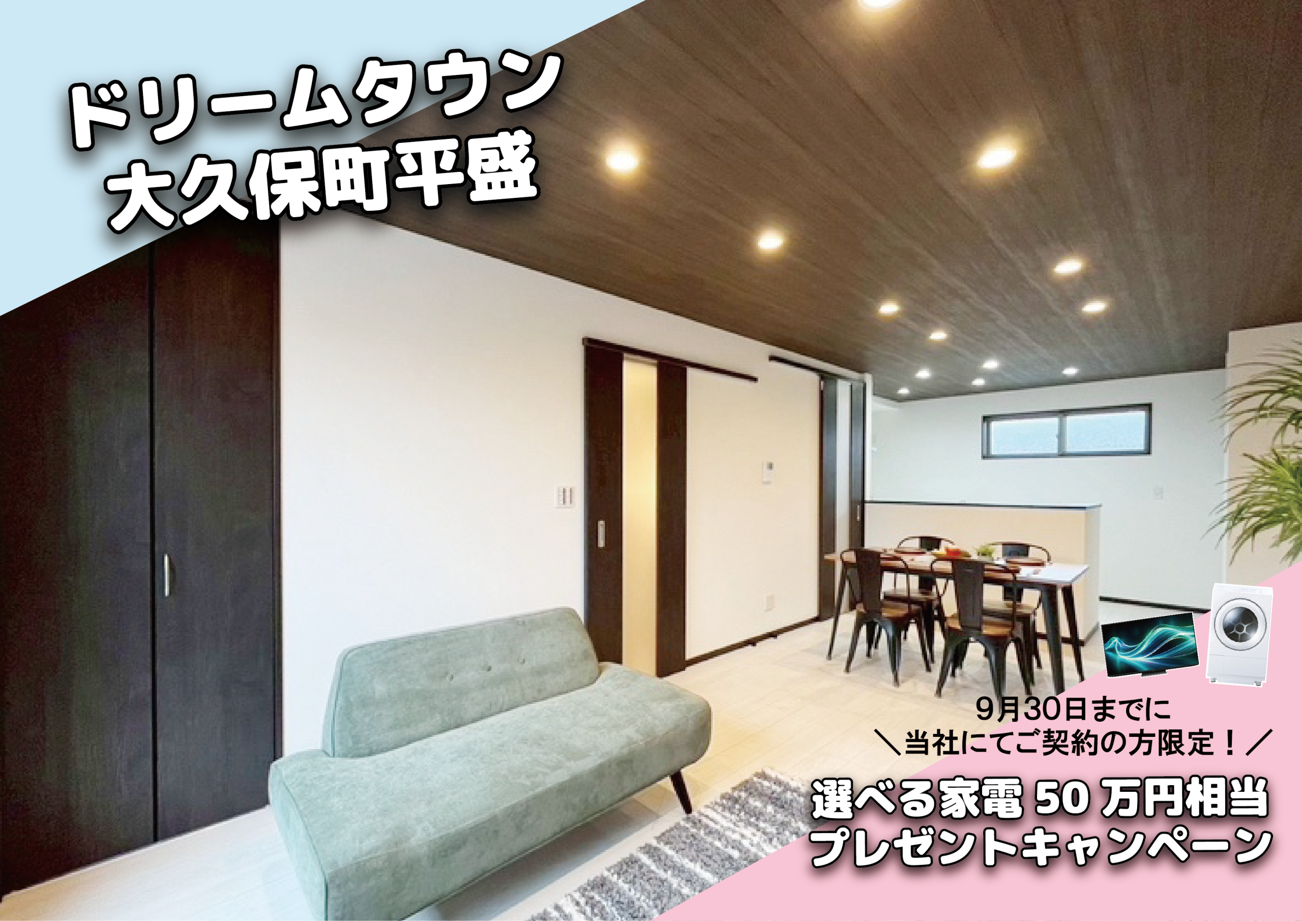 2025年9月30日までにドリームホームでドリームタウン大久保町平盛をご契約していただいた方を対象に50万円相当の家電をプレゼントいたします!